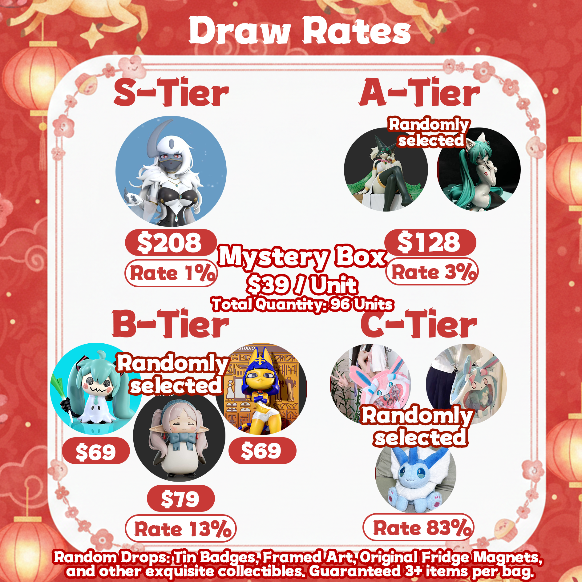 Random Drops: On top of the main tier items, every bag includes random exquisite collectibles such as Tin Badges, Framed Art, or Original Fridge Magnets.